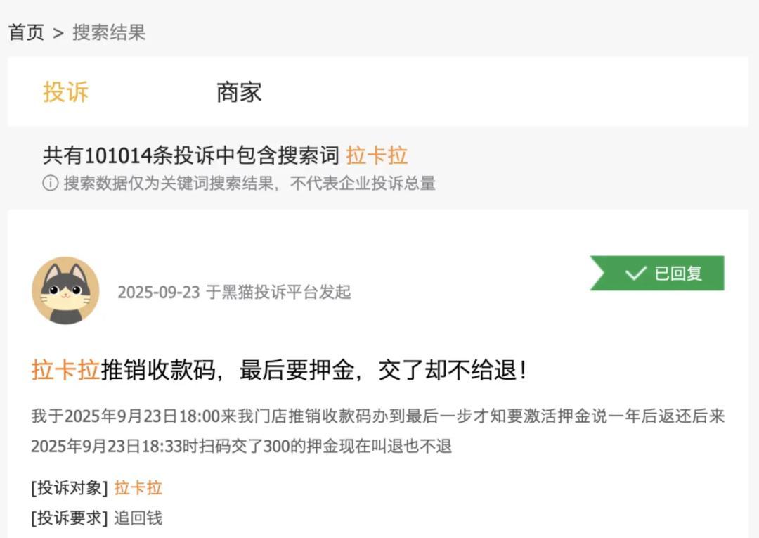 2024年6月,公安部、银保监会、最高法、央行联合下发《关于进一步规范催收行为的通知》,完善了催收的流程和要求。黑猫投诉 【下载黑猫投诉客户端】上,关于拉卡拉的投诉量已经超过10万条。其中涉及的范围很广,比如有用户表示拉卡拉押金未退还、有用户反映拉卡拉规则存在霸王条款、也有用户认为拉卡拉的服务质量差。其中也有涉及拉卡拉小贷的暴力催收,恐吓、威胁、辱骂消费者等投诉,在新规面前,拉卡拉的催收业务似乎依然有改善空间。